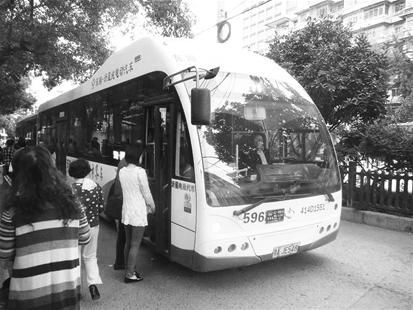 昨日,記者來到卓刀泉南路方家嘴公交車站,這里是596路的起點站。15分鐘后,一輛漂亮的新能源白色公交車開進(jìn)了站點(如右圖)。這輛公交車外觀和普通公交明顯不同,車身以白色為主,前車窗占整個車頭前面的一半,車廂兩側(cè)的車窗也占車身高度的一半,從外觀上看,比普通公交車要大得多。
