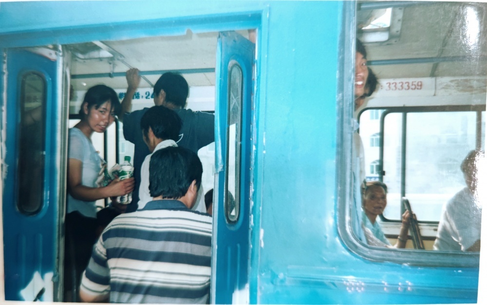 ▲00年代,售票員工作場(chǎng)景。售票員站在車門口,微笑迎著上車乘客。