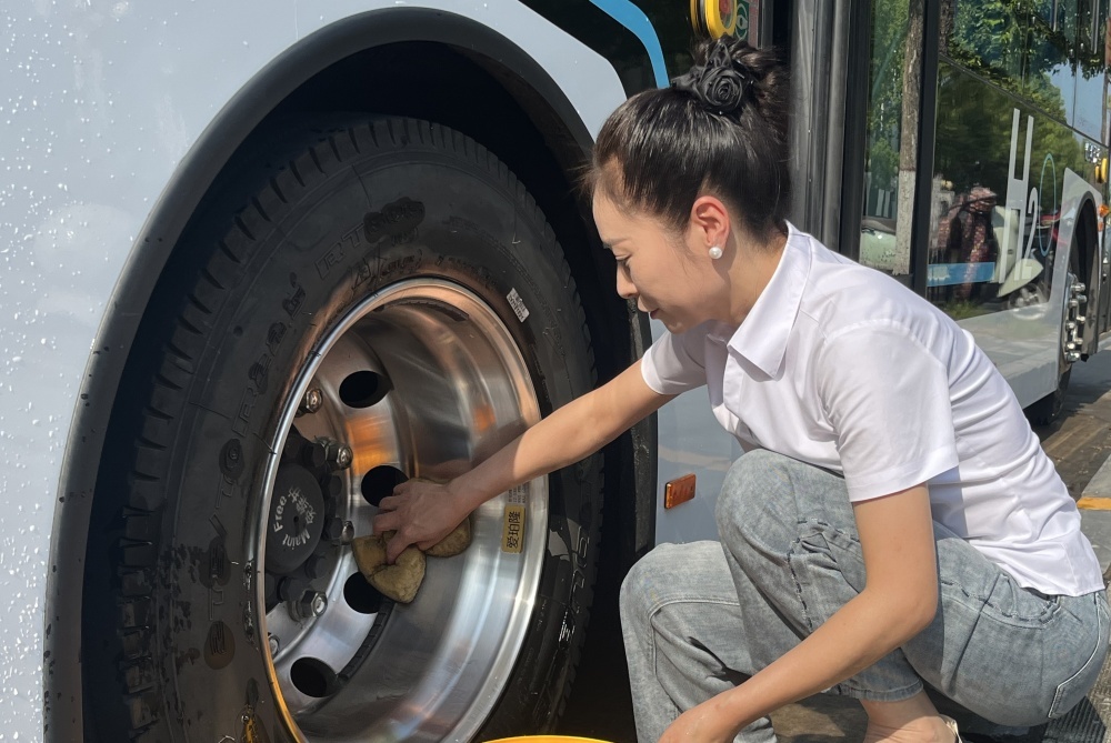 汗水濕透衣背,她細心擦拭著車輛的每一個角落,為乘客營造干凈舒適的乘車環(huán)境。