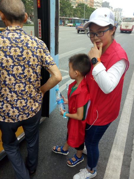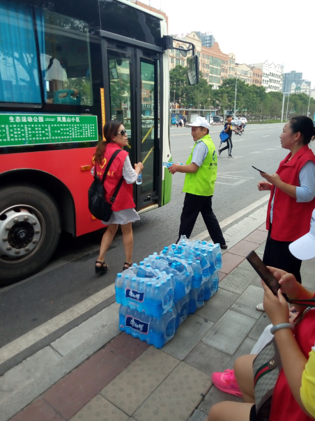 15時許,志愿者們已經(jīng)布置好了送水點,將箱礦泉水?dāng)[在了站臺旁邊。每有一輛公交車進站停靠,志愿者們都會給駕駛員們遞上兩瓶礦泉水,還有一些放暑假的小朋友們,也熱情的加入到此次活動,充當(dāng)著志愿主力軍,用他們的行動清涼了公交駕駛員的心,傳播著社會正能量。
