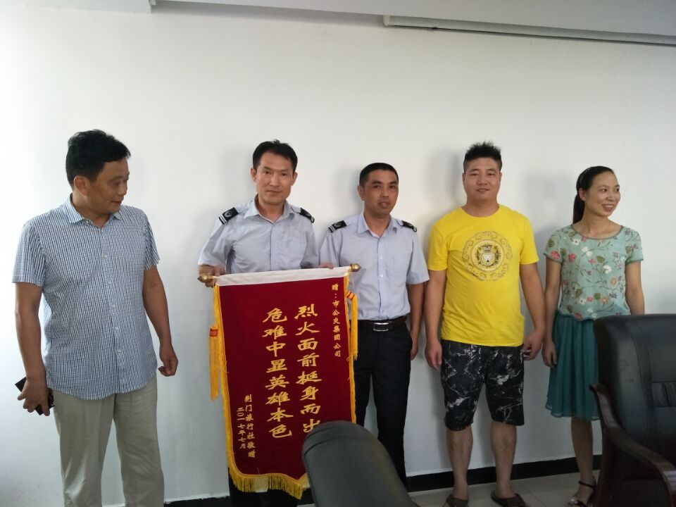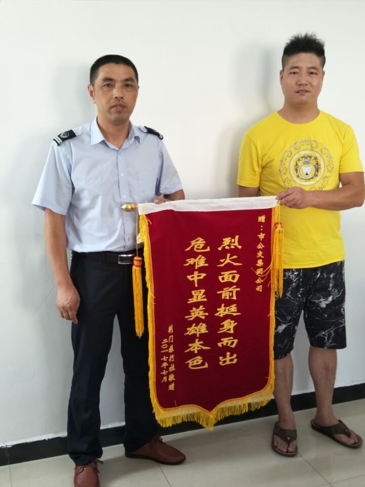 7月27日,荊門市旅行社出租汽車公司負責人及鄂H0A073的駕駛員專程來到荊門公交集團公司,為果斷義舉滅火的公交陳旭師傅送上了一面“烈火面前挺身而出,危難中顯英雄本色”錦旗。