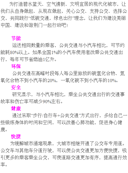 為深入推進(jìn)城市公共交通優(yōu)先發(fā)展,提高城市公共交通服務(wù)水平,加強(qiáng)城市公共交通出行的宣傳和引導(dǎo),自2013年起,交通運(yùn)輸部將每年的9月16日至22日確定為"公交出行宣傳周";。荊門公交集團(tuán)公司成立41年來,共開辟公交線路22條,擁有484臺公交車,日客運(yùn)量約22萬人次,發(fā)展迅速。但相比國內(nèi)部分發(fā)達(dá)城市,目前,我市公共交通發(fā)展仍然相對滯后,與自駕車等個人交通方式相比,在舒適性、便捷性方面競爭力也不足,并且,老百姓優(yōu)先選擇公交出行的認(rèn)識仍需加強(qiáng)。此次宣傳周活動中,荊門公交集團(tuán)公司除了組織員工走上街頭開展集中宣傳活動,重點(diǎn)宣傳公交車乘車須知、公交IC卡辦理須知等公交常識,現(xiàn)場接受市民咨詢外,還將進(jìn)社區(qū)、進(jìn)學(xué)校開展辦理公交卡等各項(xiàng)便民活動。此外,1路公交線各運(yùn)營車輛也將通過車載電視滾動宣傳城市公共交通對保障民生、推進(jìn)節(jié)能減排、減少空氣污染、緩解城市交通擁堵的重要意義,積極引導(dǎo)群眾支持和參與城市公共交通發(fā)展。